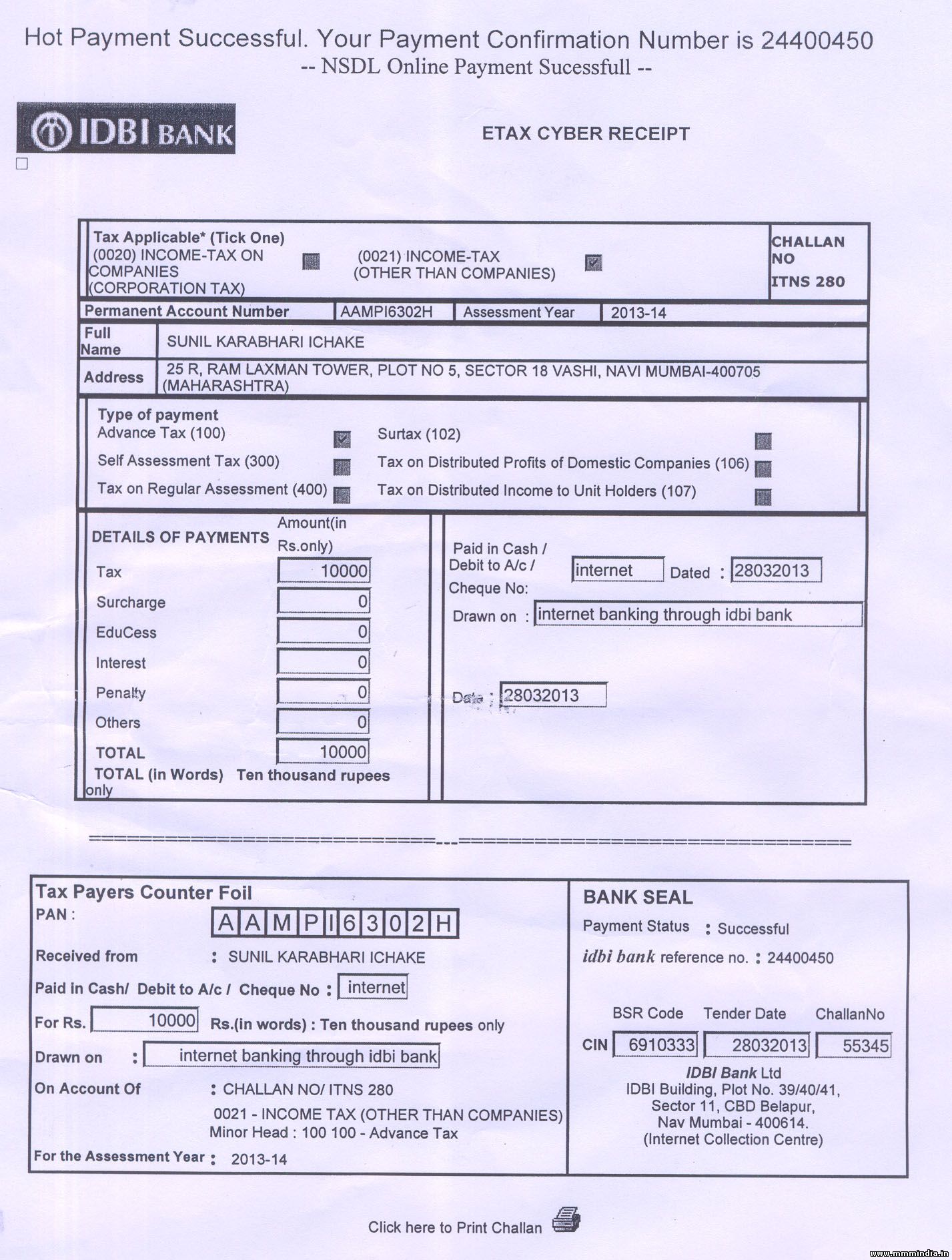 Attached is the payment proof, paid to Income Tax Department Lucknow as an Advance by one of my participant. detail is below.