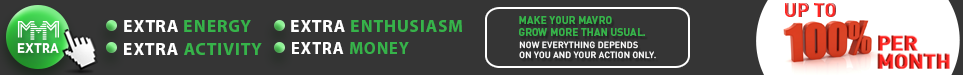 Take part in the program MMM EXTRA and get up to 100% a month for developing the Community. Do webtasks, which will take you not more than 5-15 minutes a day, and get extra interest accrued. If you have not done any task during the month, your MAVRO growth will make up 20% a month. Maximum Mavro-EXTRA growth rate is 100% a month (basic rate - 20% a month, online tasks - up to +30% a month, offline tasks - up to +50% a month)