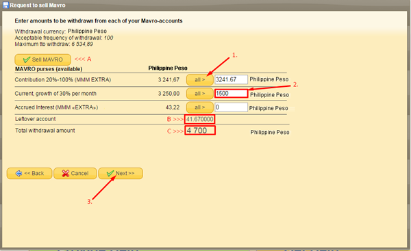 - Click on “all” to withdraw maximum amount of specific mavro-account.