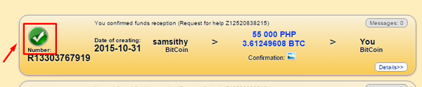 Appeared orders on your Dashboard will be of yellow color. After a sender confirmed that funds had been transferred, make sure to check your account. You should confirm a receipt of funds only when you see them in your account.